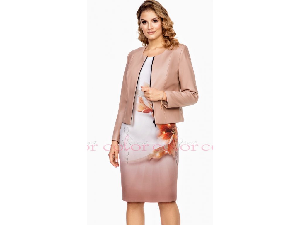 Dámský komplet pouzdrové šaty s květy a sako v béžových odstínech J690